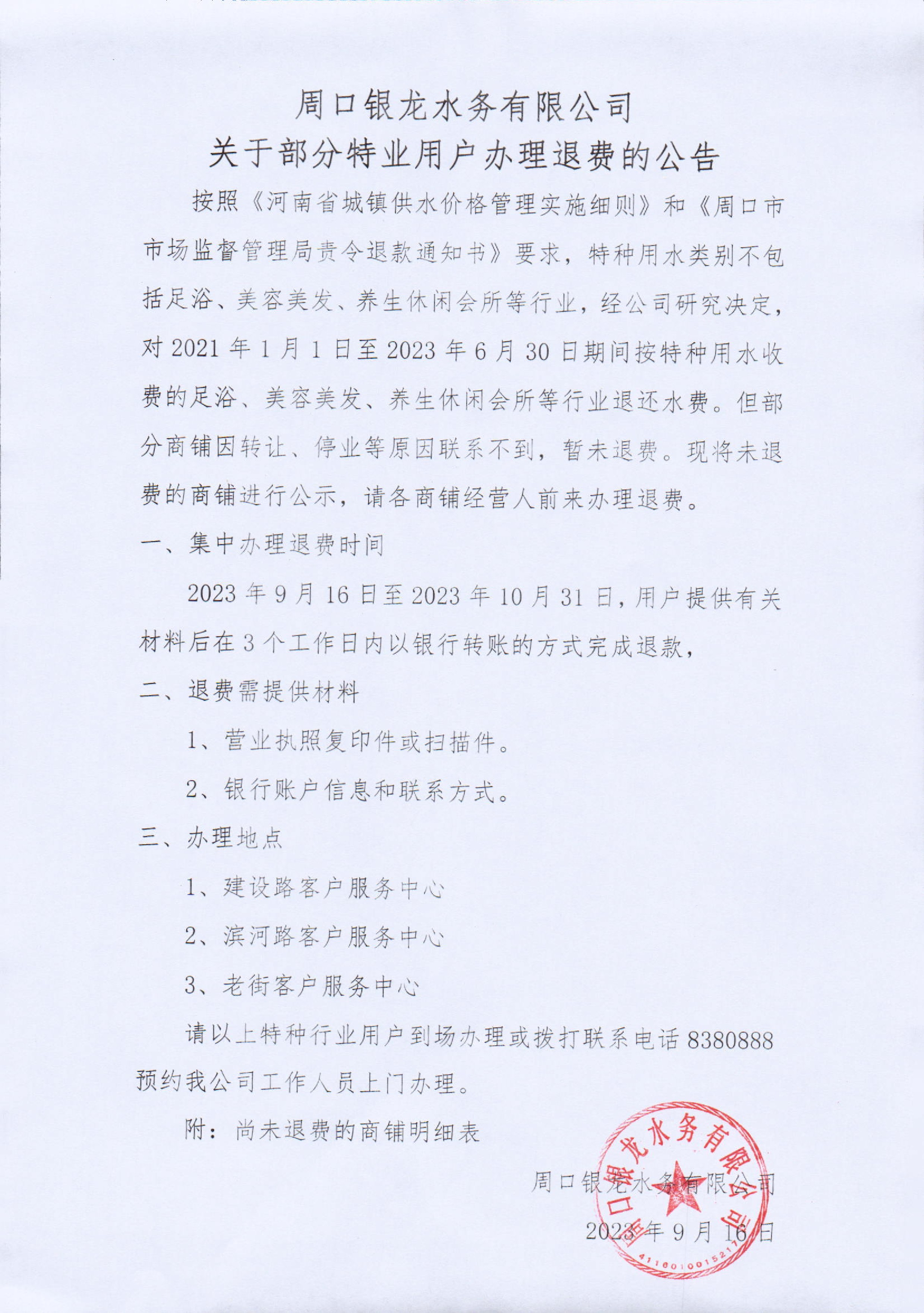 周口銀龍水務(wù)有限公司關(guān)于部分特業(yè)用戶辦理退費(fèi)的公告按照《河南省城鎮(zhèn)供水價格管理實(shí)施細(xì)則》和《周口市市場監(jiān)督管理局責(zé)令退款通知書》要求,特種用水類別不包括足浴、美容美發(fā)、養(yǎng)生休閑會所等行業(yè),經(jīng)公司研究決定...